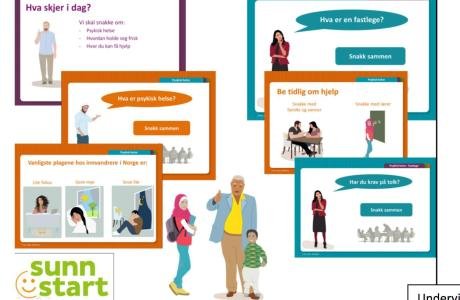 Beskrivelse: Ressurssenter for migrasjonshelse i Oslo kommune har utarbeidet undervisningsmaterialet SUNN START. Dette er tilpasset personer med innvandrer- og flyktningebakgrunn i Norge. Tema i undervisningen er «Psykisk helse», «Mat og helse» og «Munnhelse».