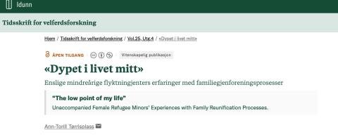 Forskningsartikkelen "Dypet i livet mitt – Enslige mindreåriges erfaringer med familiegjenforeningsprosesser" (2022) er et studie om enslige mindreårige flyktningjenters erfaringer med familiegjenforeningsprosesser. Familiegjenforeningsprosessen skjer ofte i en fase der den enslige mindreårige jenten er på vei inn i en selvstendig voksentilværelse og kan derfor innebære store utfordringer for den enkelte. I dette studiet presenteres noen av disse utfordringene.