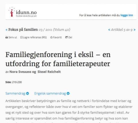 Nora Sveaas og Sissel Reichelt ved Universitetet i Oslo skrev i 2011 en fagartikkel i Fokus på Familien om utfordringer ved familiegjenforening. Artikkelen er en del av det faglige grunnlaget for prosjektet “Familiegjenforening i eksil -Forebygging gjennom familiesamtaler” som har en egen omtale på dette nettstedet.