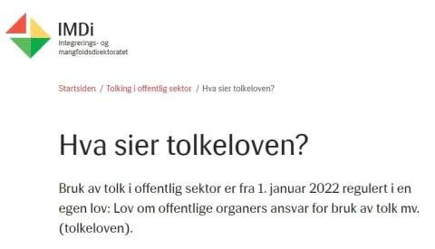 I denne artikkelen har vi oppsummert viktige bestemmelser om bruk av tolk i tolkeloven og særlovgivningen. Se lovdata.no for tolkeloven i sin helhet, samt forskriften til tolkeloven. Du finner også forklaring fra IMDI på hva endringer i tolkeloven innebærer for tolker.