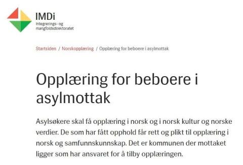 Asylsøkere skal få opplæring i norsk og i norsk kultur og norske verdier. De som har fått opphold får rett og plikt til opplæring i norsk og samfunnskunnskap. Det er kommunen der mottaket ligger som har ansvaret for å tilby opplæringen. På hjemmesiden til