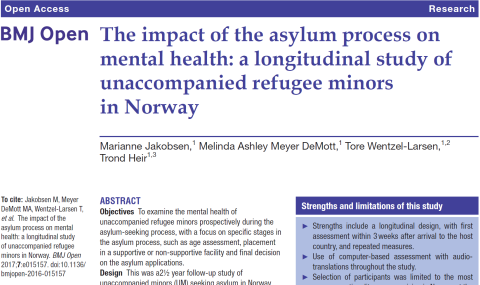 Artikkelen skrevet av Jakobsen, Meyer DeMott, Wentzel-Larsen og Heir ble publisert på BJM Open, mai 2017. Hensikten var å undersøke mannlige enslig mindreårige asylsøkeres psykiske helse gjennom ulike faser av asylprosessen. De rapporterte høyt nivå av psykisk stress ved ankomst. De som ble vurdert som overårige og plassert i mottak for voksne, viste økning i psykisk stress sammenlignet med de andre. Avslag på asylsøknad var høyt assosiert med økt psykisk stress. Forskerne konkluderte med at psykisk helse hos unge asylsøkere synes å bli negativt påvirket av lav grad av støtte og avslag på asylsøknad.