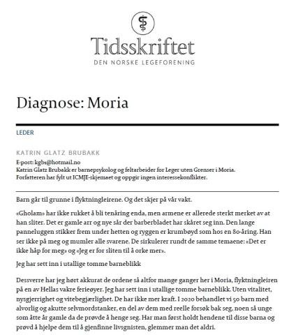 «Barn går til grunne i flyktningleirene. Og det skjer på vår vakt». Slik beskriver barnepsykolog og feltarbeider for Leger uten grenser Katrin Glatz Brubakk situasjonen for flyktningbarn i Moria- leiren. I en lederartikkel i Tidsskriftet for den Norske Legeforening, 2021, rapporterer hun om alvorlig selvmordsproblematikk og psykiske lidelser for Post traumatisk Stresslidelse, angst og depresjon. Mange av de psykiske lidelsene ser ut til å ha sitt utspring i traumatiske erfaringer i forbindelse med krig, forfølgelse og flukt, men det rapporteres om forverring etter ankomst til flyktningleiren. Ekstreme og marginale livsbetingelser, risiko for nye traumatiske hendelser, utmattelse og mangel på håp for fremtiden gjør at Brubakk konkluderer med at barnas primærdiagnose må være «Moria».
