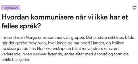 Norskkunnskapene blant flyktninger er varierende. Det kan være utfordrende både for flyktninger og hjelpere når de ikke snakker samme språk. I mange sammenhenger er det behov for å kommunisere via tolk. Fagartikkelen «Hvordan kommunisere når vi ikke har felles språk?» belyser ulike problemstillinger knyttet til norsk som andre språk, språklige utfordringer i samspillet, bruk av tolk, samt ulike kommunikasjonsmetoder.