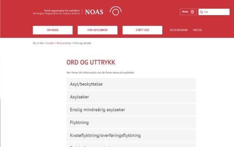 Norsk Organisasjon for Asylsøkere, NOAS, forklarer sentrale ord og uttrykk innen asylfeltet på sin hjemmeside under ord og uttrykk. Her finner en også informasjon om de mest sentrale oppholdsstatusene: Asylsøker, Asyl/Beskyttelse, Opphold på humanitært grunnla, status i henhold til Dublin-avtalen, Kvoteflyktning/overføringsflyktning, papirløse.