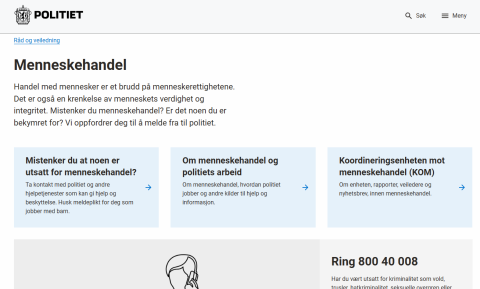 På politiets temasider om menneskehandel finner du blant annet informasjon om hvordan politiet jobber mot menneskehandel, hva du kan gjøre hvis du mistenker at noen er utsatt for menenskehandel, og informasjon om Koordineringsenheten mot menneskehandel (KOM).