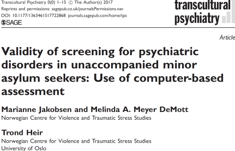 Artikkelen “Validity of screening for psychiatric disorders in unaccompanied minor asylum seekers: Use of computer-based assessment” av M. Jakobsen, M.A. Meyer DeMott og Trond Heir ble publisert i Transcultural Psychiatry 0(0), 2017, s 1–15. Hensikten med studiet var å evaluere validiteten til Hopkins Symptoms Check List (HSCL-25) og Harvard Trauma Questionnaire (HTQ, Part IV) på et utvalg enslige mindreårige asylsøkere fra Afghanistan og Somalia fire måneder etter ankomst til Norge. Screeningen var databasert og levert på morsmålet til deltagerne. Forskerne konkluderte med at slik databasert kartlegging i en slik setting var praktisk, kostnadseffektiv og anbefalelsesverdig.